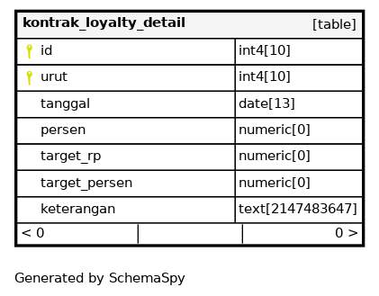 | kontrak_loyalty_detail_id_urut_pk | Primary key | Asc/Asc | id + urut |